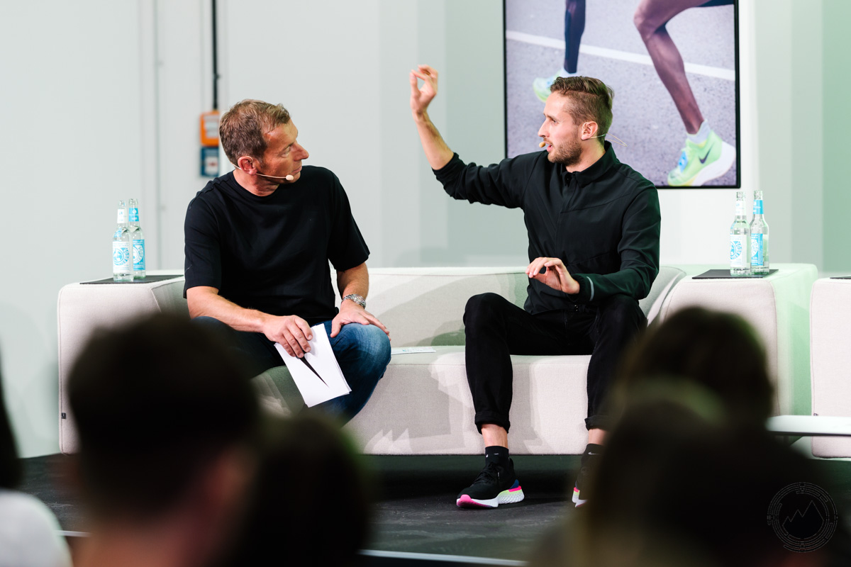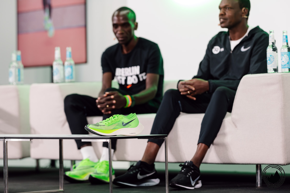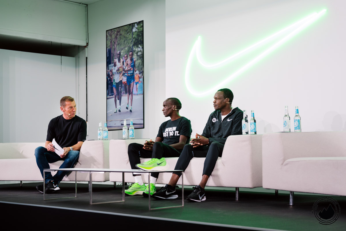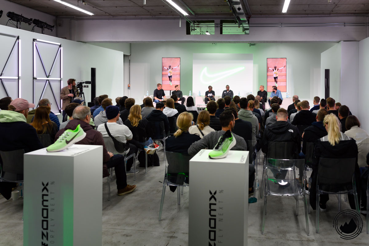 Neben Weltrekordhalter Eliud Kipchoge nahmen auch sein Trainer, Olof Sköld von Maurten, Keith Houlemard von Nike sowie Paul Schmidt an der Diskussion teil. Zunächst ging es natürlich um die Leistungen von Eliud Kipchoge, welcher neben dem WR in Berlin, auch vor Kurzem den London Marathon gewinnen konnte. Bemerkenswert, wie bodenständig der schnellste Marathon-Läufer der Welt viele Dinge erklärte. So sind Kraftübungen auch nicht seine liebsten Einheiten im Training, aber sie gehören nun mal dazu, wenn man besser werden möchte. Er stellte auch klar, dass hinter seinen Weltklasse–Leistungen sein ganzes Team steckt. Ohne strukturiertes Training, Trainingspartner, Ausrüstung und Ernährung wären diese Leistungen nicht umsetzbar. In Sachen Ausrüstung stellte uns Keith Houlemard den neuen Nike ZoomX Vaporfly Next% vor.